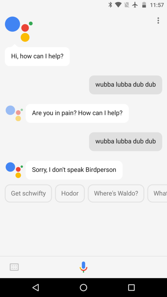 Apakah Anda berbicara orang burung? TIDAK? Jangan khawatir; Asisten Google Anda juga tidak. Buka saja dan ucapkan «wubba lubba dub dub» dan lihat tanggapannya yang cerdas. Anda juga bisa mencoba «going schwifty», jika Anda adalah penggemar Rick & Morty.