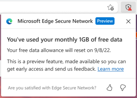 Saat browser Edge berjalan di komputer Anda, ketuk ikon pelindung yang muncul di bilah alat. Anda sekarang akan melihat berapa banyak data yang tersisa dari batas 1 GB yang Anda berikan.